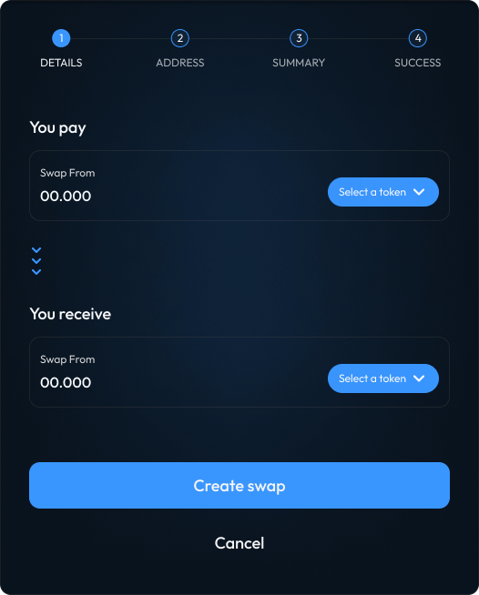 Choose the crypto you want to swap, how much, and what crypto you want to receive. Receive instant estimates as you modify your selection on the fly.